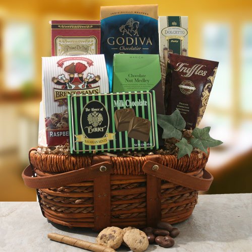 This gift ships SAME DAY when ordered by 12 noon Central Time on a Business day (typically M - F).Design It Yourself Gifts & Baskets proudly holds a Better Business Bureau A+ Rating!.Our products are always fresh. All gifts are made-to-order after the order is received..This gift may be shipped anywhere inside the Continental U.S. (Excludes APO/FPO Addresses).100% SATISFACTION GUARANTEE! If you're not absolutely delighted we'll happily arrange an exchange or refund. Your choice.. A simply splendid display of chocolate goodness that's sure to pass any chocolate connoisseur taste test. Indulge their palate with Godiva chocolate gems, milk chocolate nut medley mix, Belgian truffles, cookies and more....
